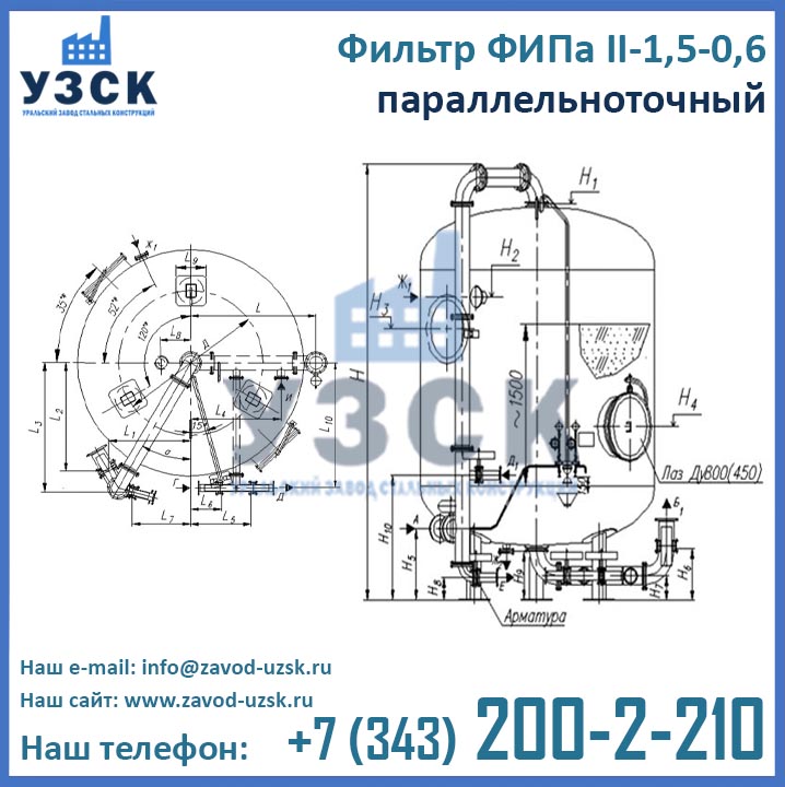 Цены фильтра ФИПа 2 ступени 1,5-0,6 формируются в соответствии со множеством факторов, таких как материальное исполнение, тип распределительных устройств, требуемая комплектация, необходимости доставки и т.д. Для расчета цены фильтров ФИПаII-1,5-0,6 в Архангельске обратитесь в отдел продаж Уральского Завода Стальных Конструкций по координатам, указанным в разделе «Контакты».